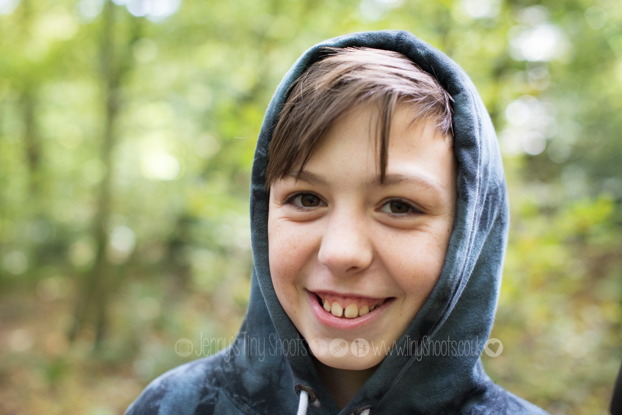 Boy grinning at camera in the forest