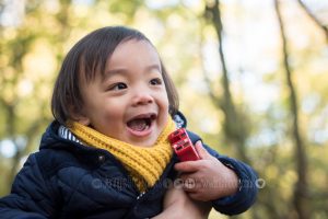 Boy grinning at camera in the forest